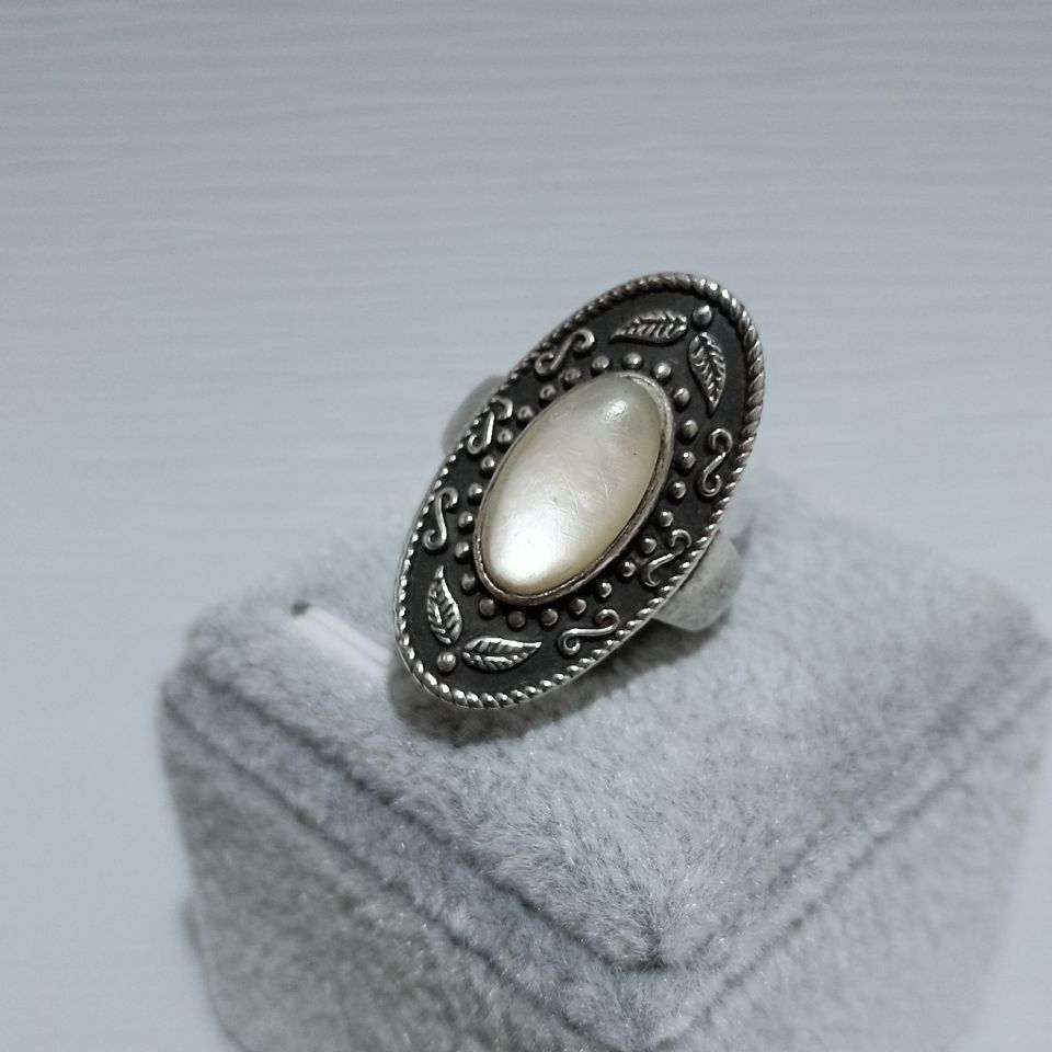 Anel Prateado oval detalhe Indiano com Madrepérola natural