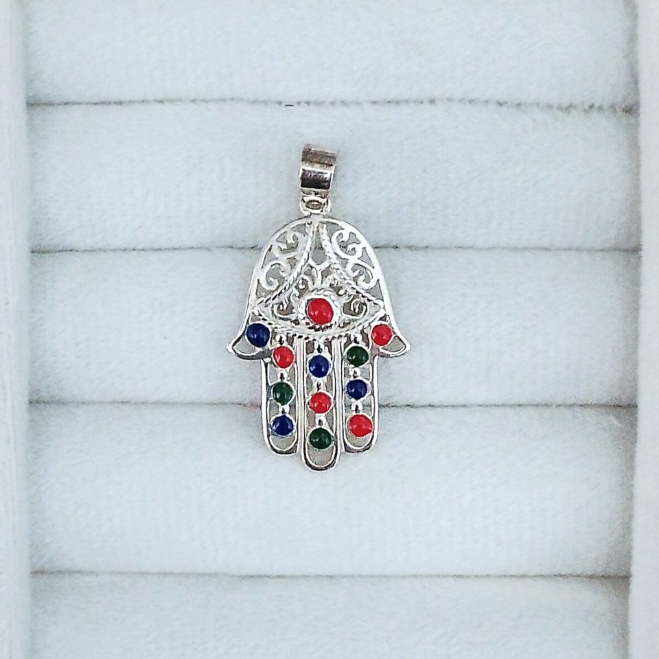 Pingente Prateado Mão de Fátima Hamsá Tam. M detalhe Resina Color M02